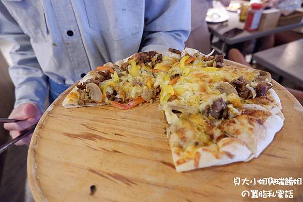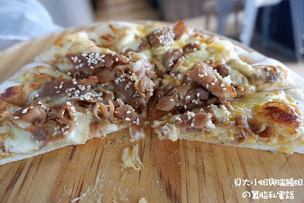 媽媽在旁吃著新出爐的壽喜燒豬肉Pizza