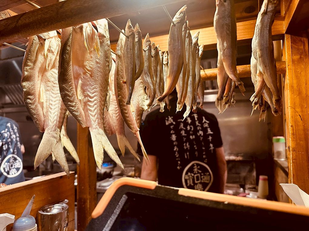 吧台邊吊著一條條的一夜干