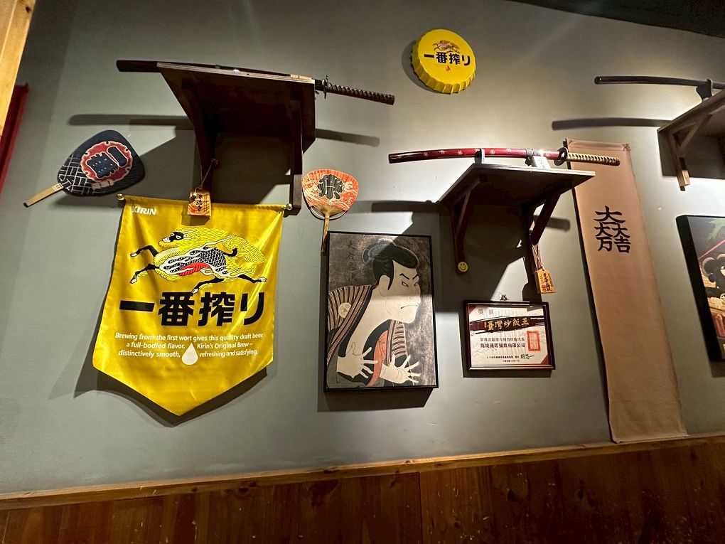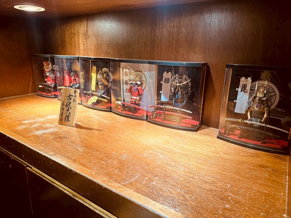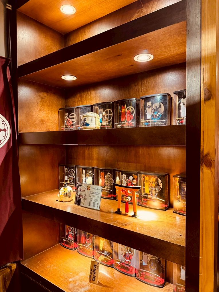 層架展示滿滿的武士刀與日本元素的收藏